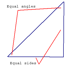 An isoceles right triangle has angles of 90, 45 and 45 degrees.