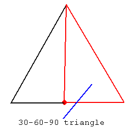 We can get another useful triangle from the equilateral by drawing a line from one corner to the middle of the other side, making two right triangles: