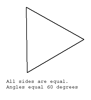 Equilateral means equal sided. All sides and angles are equal. The angle is one third of 180 or 60 degrees.